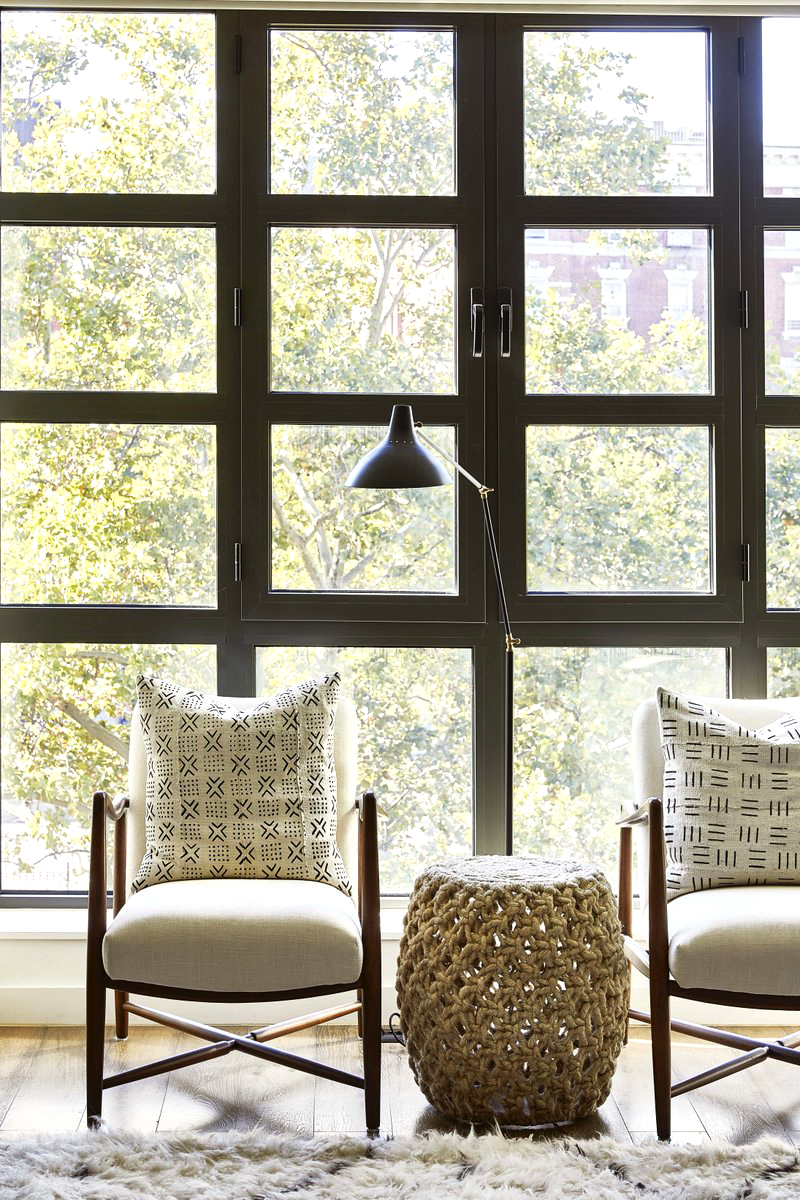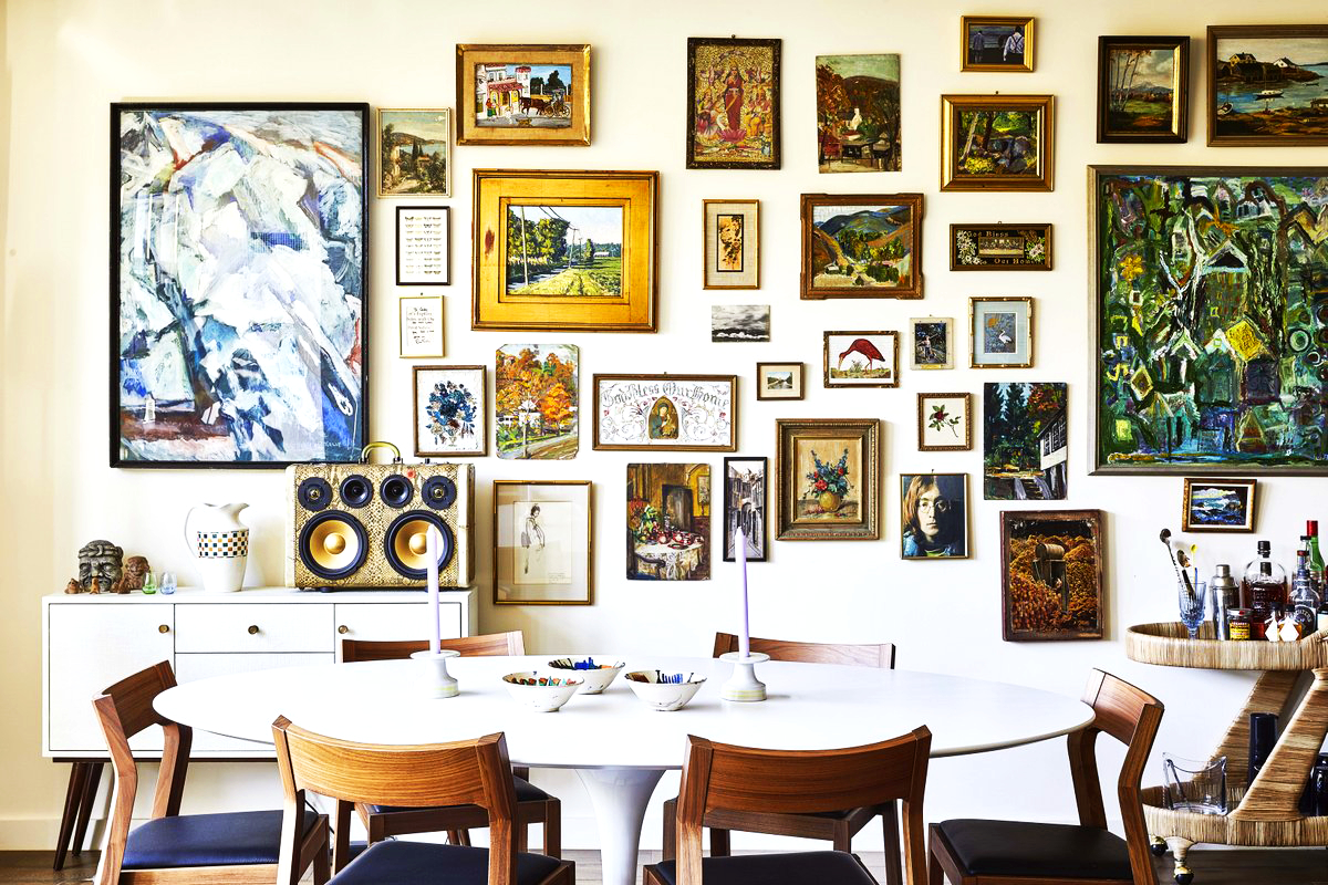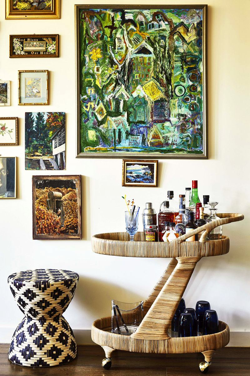 In the NYC home that follows, this sensibility comes alive through a dynamic play of texture and form—from a gallery-style wall spattered with an array of wooden frames in varying shapes and sizes, each piece adding its own narrative, to a textured drink cart and side-stool wrapped in bamboo that introduces an unexpected, tactile contrast beneath.