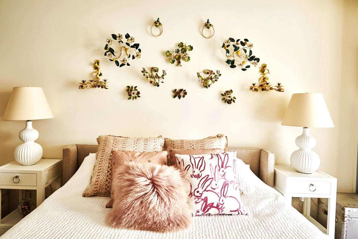 And in the bedroom, an ornate wall of sculptural metal—featuring organic leaves, winding vines, and even integrated functional elements—creates a striking focal point above a layered bed of richly textured fabrics and fur pillows. The result is a series of spaces that feel collected over time, where every surface invites touch and every detail contributes to a sense of depth, warmth, and individuality.