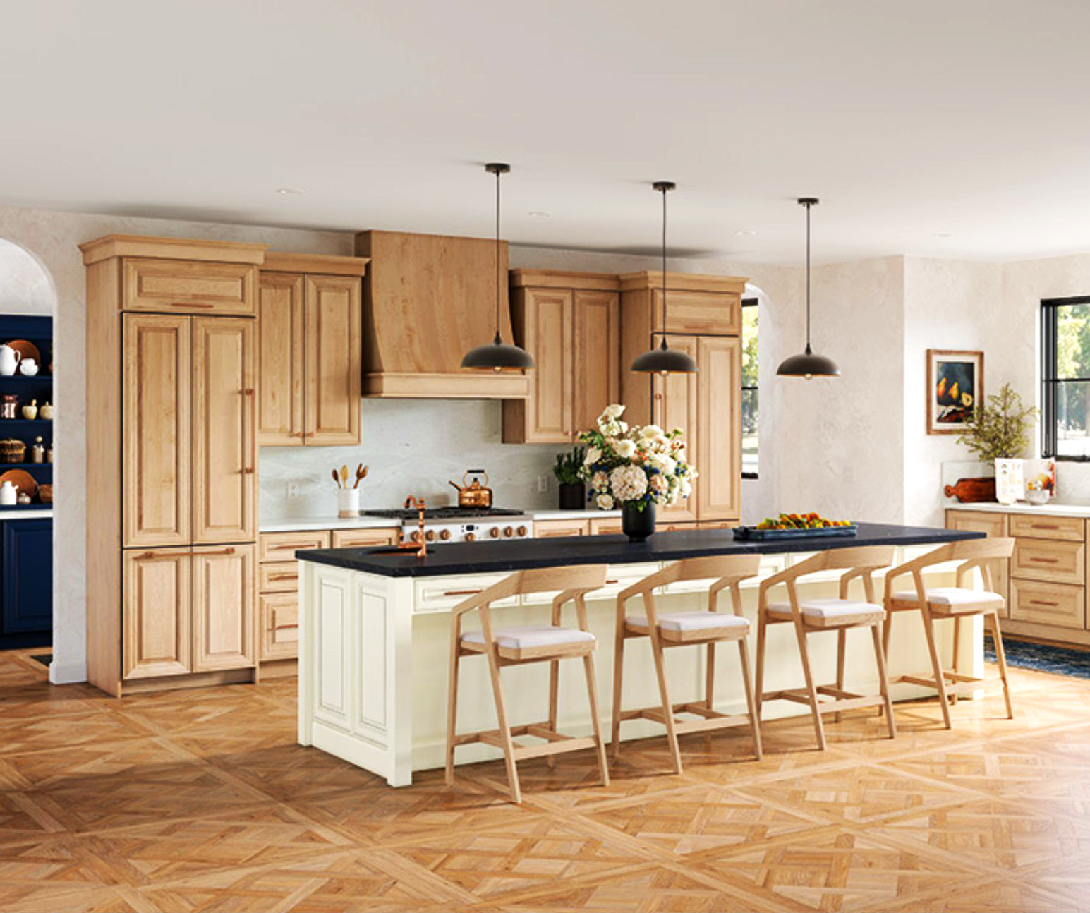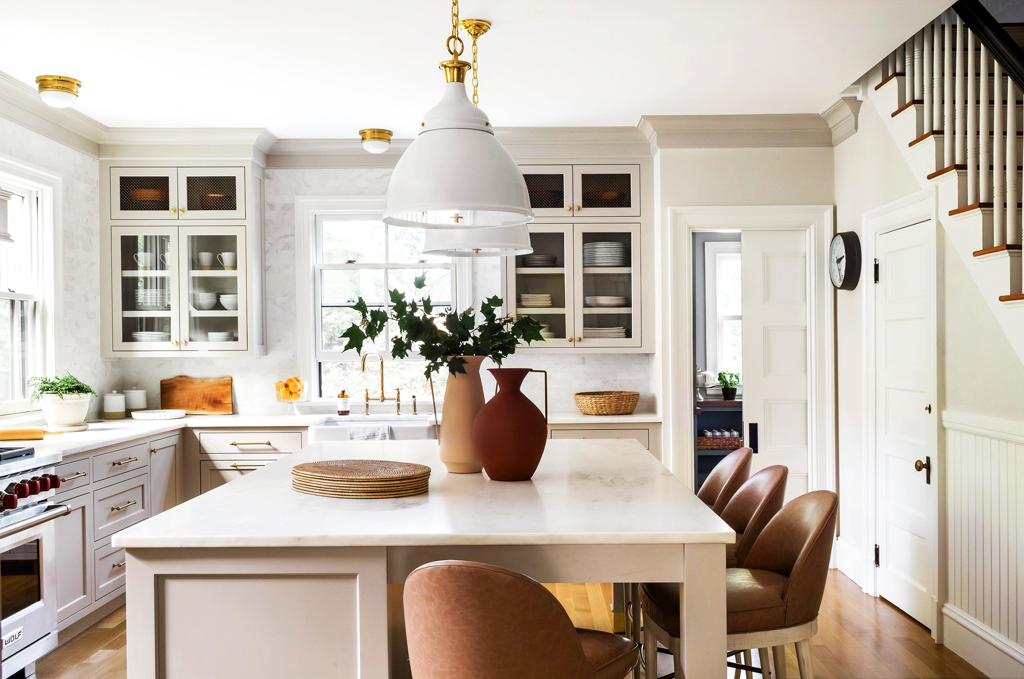 This approach is equally compelling in the below kitchen, where Pantone Cloud Dancer is used as a full color drench across the walls, backsplash, ceiling, and expansive family-style island, beautifully offset by natural wood cabinetry, a decorative golden wood inlaid floor, and antique-modern farmhouse pendant lighting for a look that feels warm, cohesive, and effortlessly defined.