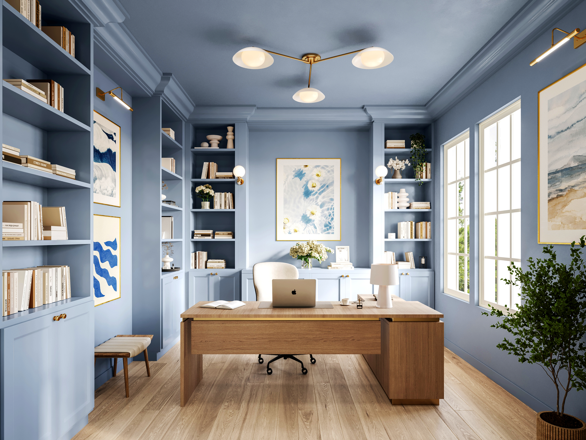 In the studio office above, designed by Jessie K Homes, that sense of identity is immediately felt. A periwinkle blue color drench sets the tone, creating a calm yet expressive backdrop, while organic-shaped wall art and landscape imagery add layers of visual interest and meaning. Natural light, carefully placed greenery, and soft, inviting furnishings further shape the atmosphere, while even the arrangement of books and supplies feels intentional—less about perfection, more about personality. The result is a space that feels distinctly lived-in and authentic, where every detail offers a glimpse into the life and character of its inhabitant.