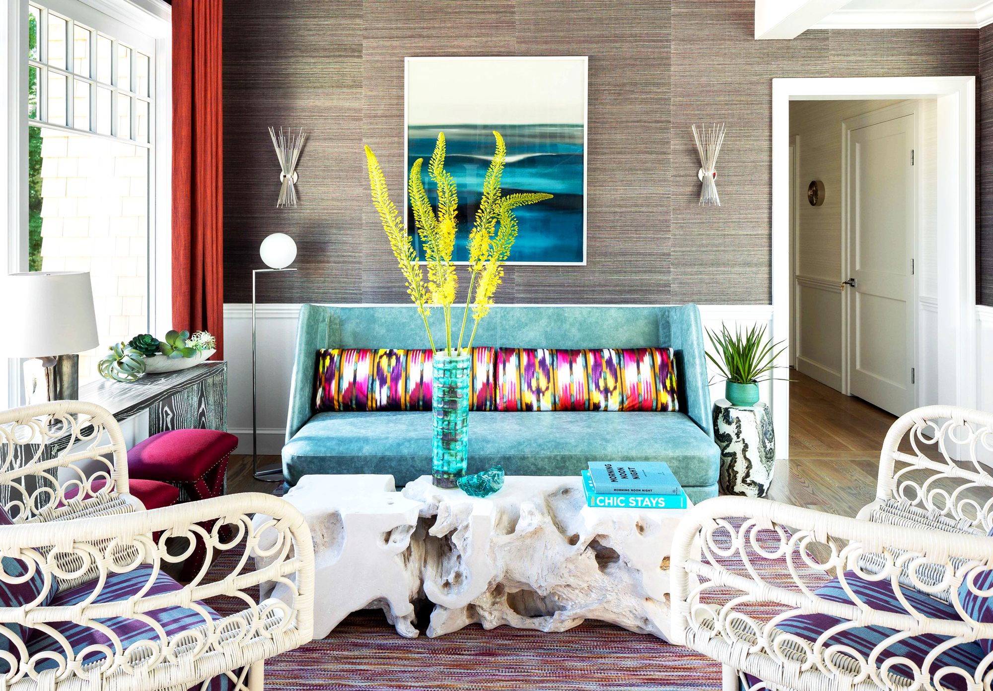 This living room with dramatic color and rich textural accents, mixes exotic charm with old-world historic mill work that’s bathed in bright aqua and subdued by warmer wood and gold tones – giving an exquisitely modern take on trends rooted in timeless design. We especially love the scalloped arm chairs, organic artwork, curved book case and tiered chandelier with tassel-touch.