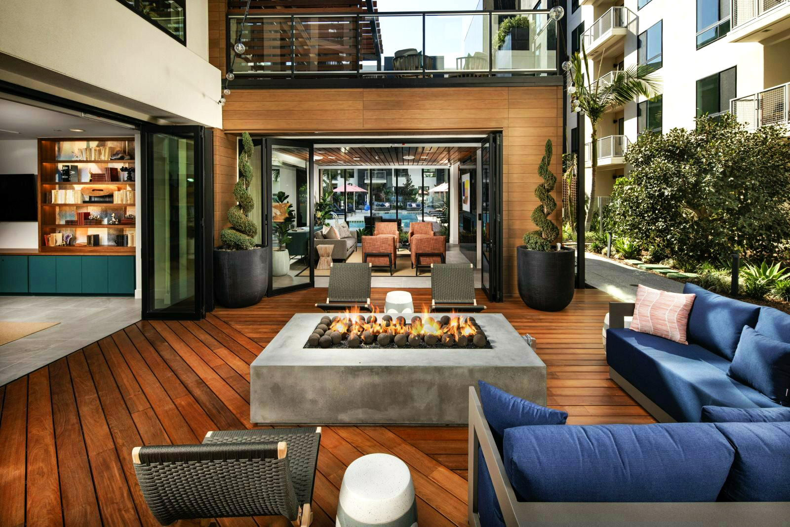 Design elements carry fluidly from one space to the next: hardwood flooring extends outward or is echoed in natural decking, fireplaces anchor both interior living rooms and outdoor lounges, and thoughtfully arranged seating areas invite gathering on either side of the threshold. Railings, walkways, and layered plantings guide movement through the space, while surrounding landscapes are designed as an extension of the home itself—framing views, softening architecture, and creating a continuous, immersive environment.