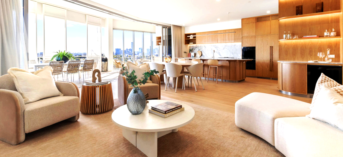 This shift reflects a broader move away from overly light, uniform interiors toward spaces that feel more layered and substantial. In airy condos, darker wood elements—whether through furniture, cabinetry, or flooring—help anchor the space, creating contrast against softer, neutral palettes.