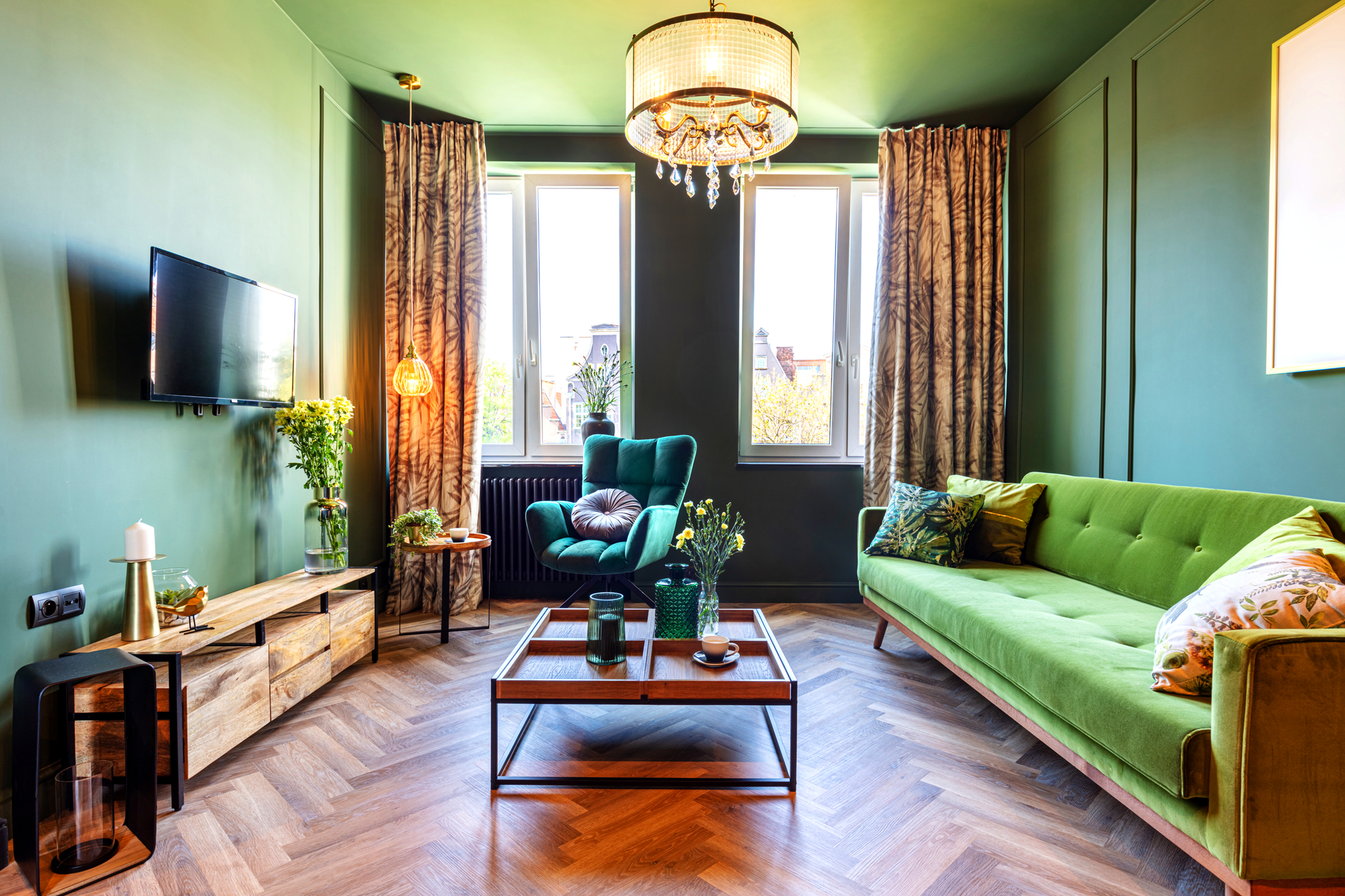 One of the most talked-about trends this year is Color Drenching 2.0—where walls, trim, and even ceilings are enveloped in the same rich hue, creating a dramatic, cocoon-like effect. The result is a moody, high-end look that highlights architectural details, softens visual boundaries, and can even make smaller rooms feel more expansive.